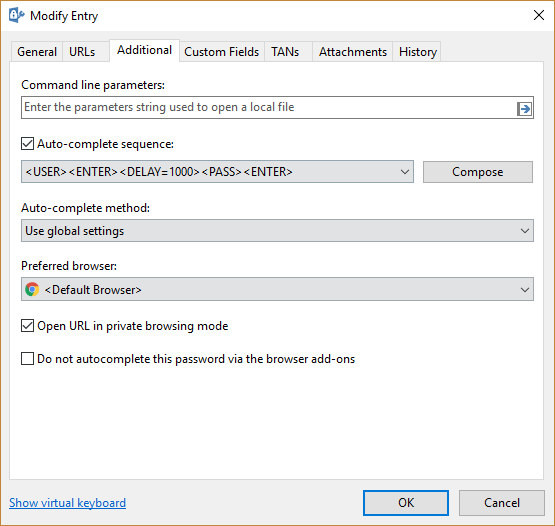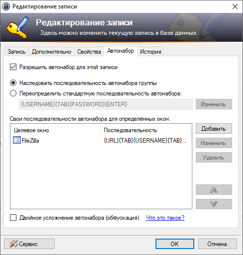 - В KeePass Установить следующую последовательность команд: {URL}{TAB}{USERNAME}{TAB}{PASSWORD}{ENTER}