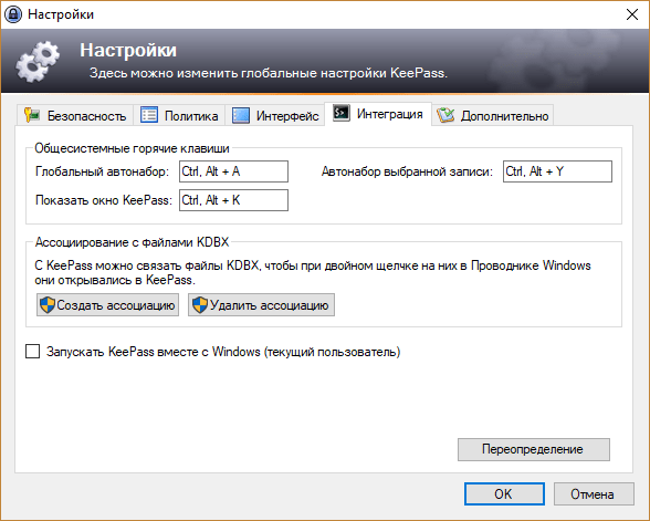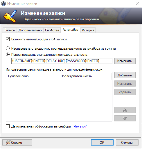 - В KeePass Установить следующую последовательность команд: {Title}{TAB}{UserName}{TAB}{Password}{ENTER}