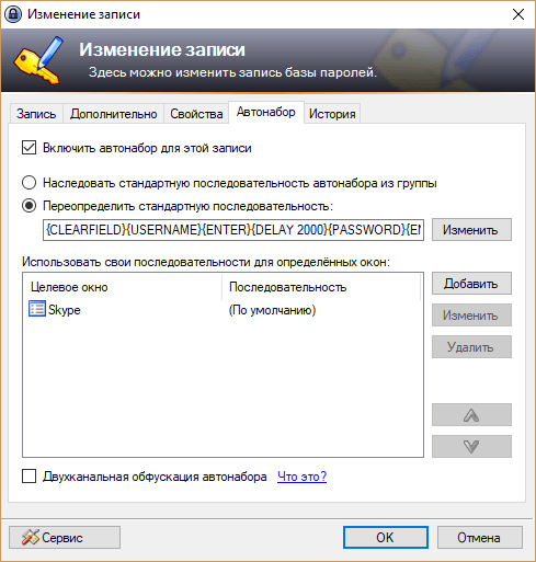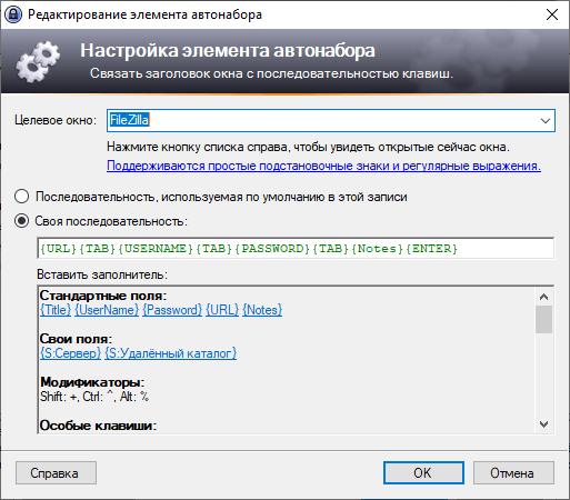 - В KeePass Установить следующую последовательность команд: {S:Сервер}{TAB}{USERNAME}{TAB}{PASSWORD}{ENTER} (в этом случае в конструкторе автонабора появится соответствующая команда {S:Сервер}, которую и нужно использовать)